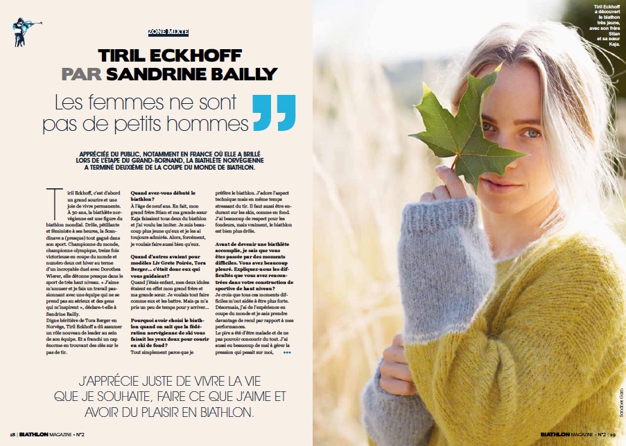 - Un grand entretien : Tiril Eckhoff répond aux questions de Sandrine Bailly. La numéro 2 mondiale se confie sur sa vie, sa passion pour le biathlon, sa carrière sportive, sa famille…